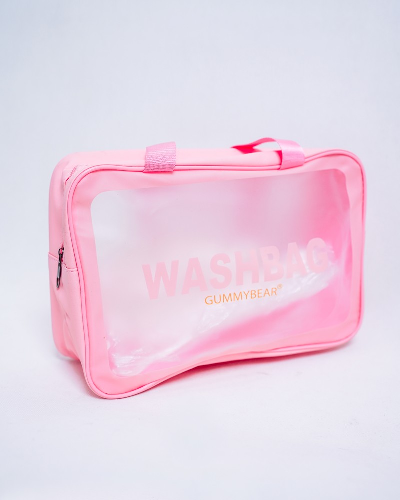 Petite trousse de toilette transparente rose avec inscription "WASHBAG GUMMYBEAR". Design waterproof avec fermeture zip et poignée pratique. Parfaite pour organiser vos essentiels beauté en voyage ou au quotidien.
