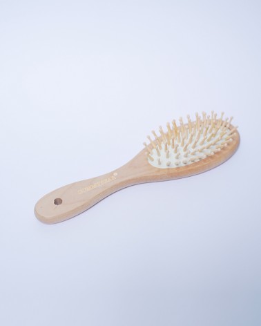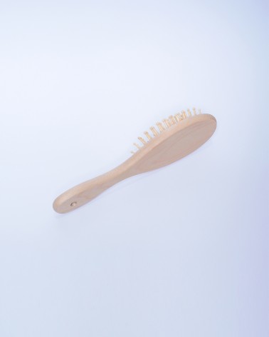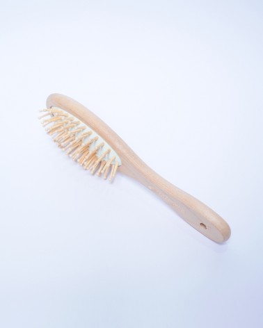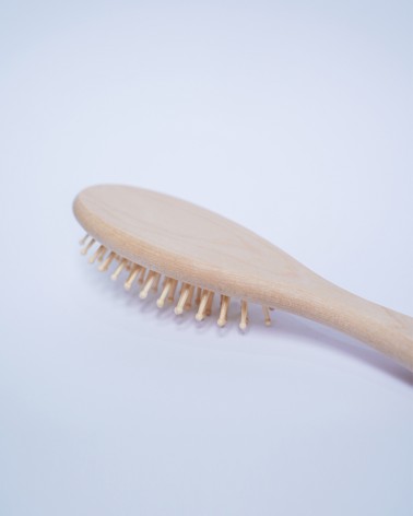 Brosse à cheveux artisanale en bois naturel avec picots en bambou, conçue pour un brossage doux et respectueux de votre cuir chevelu. Son design ergonomique et sa finition lisse offrent une prise en main confortable pour un démêlage efficace sans casse. Idéale pour tous types de cheveux, cette brosse écologique stimule la circulation sanguine du cuir chevelu tout en distribuant uniformément les huiles naturelles des racines aux pointes pour des cheveux brillants et en bonne santé.